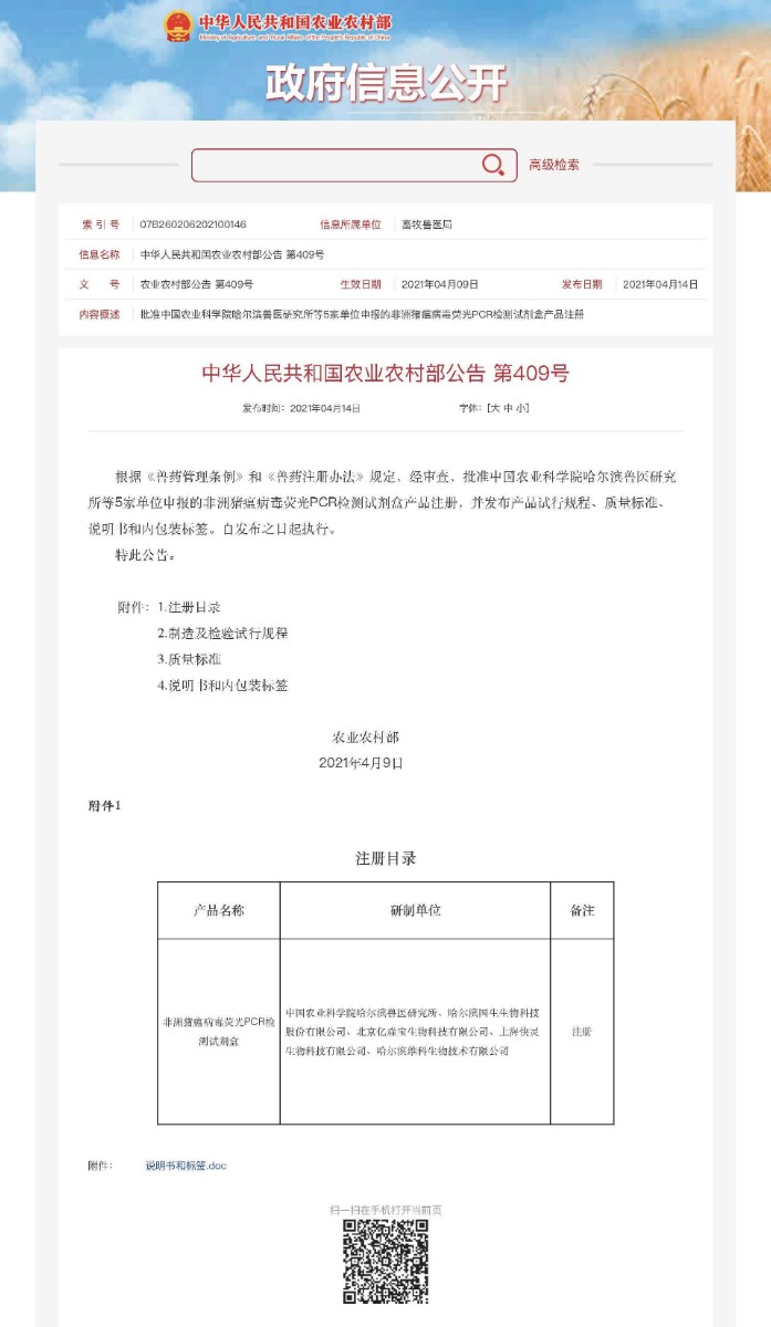 2021年4月14日,農(nóng)業(yè)農(nóng)村部發(fā)布第409號公告。